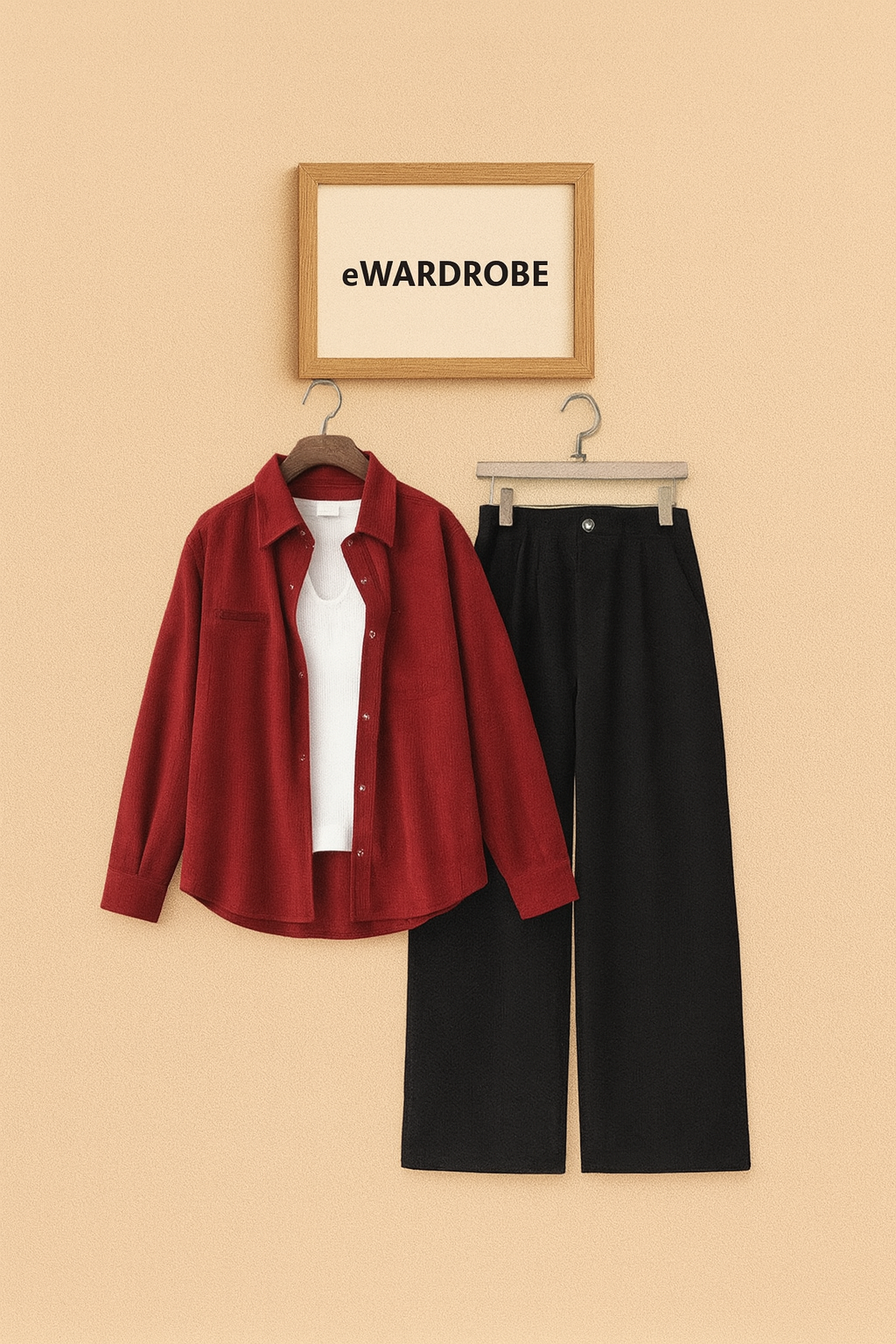 MAROON BUTTON SHIRT WITH INNER AND BLACK WIDE LEG JEANS (3PCS)