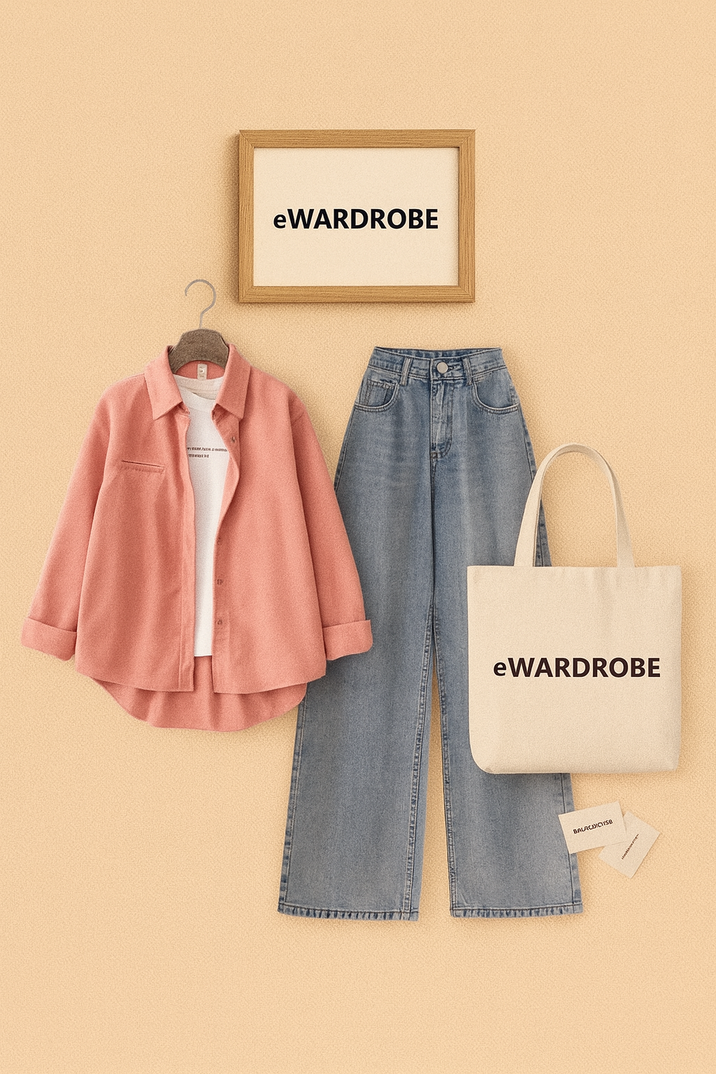 PINK BUTTON DOWN SHIRT WITH INNER AND WITH ICE BLUE WIDE LEG JEANS (3PCS)